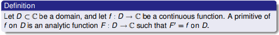<tr><td>Нехай $D \in C$ буде областю визначення і нехай $f : D \to C$ буде неперервною функцією. Первісна $f$ у $D$ це аналітична функція $F : D \to C$ така, що $F' = f$ у $D$.</td></tr>