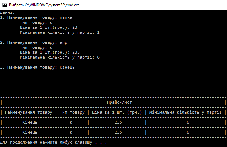 cout << cntr + 1 << ". Найменування товару: ";