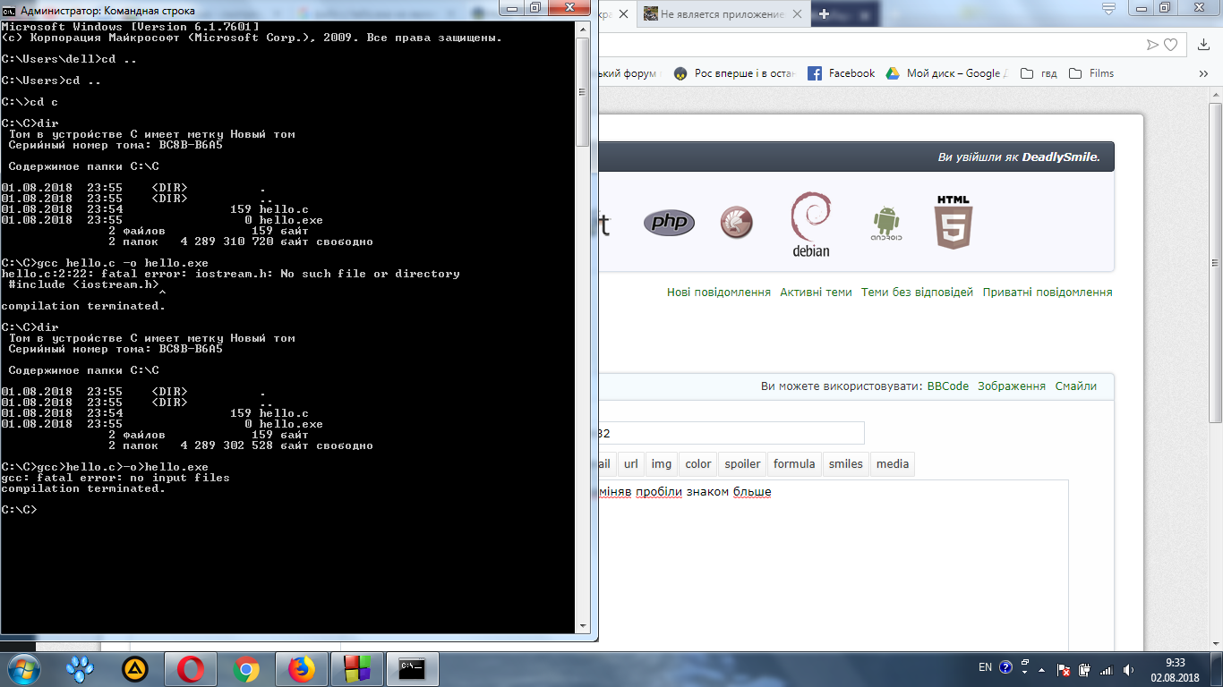 Далі при компіляції hello.c стається помилка через непідтримуваний інклуд — в результаті, екзешник лишається той же, що й був раніше.