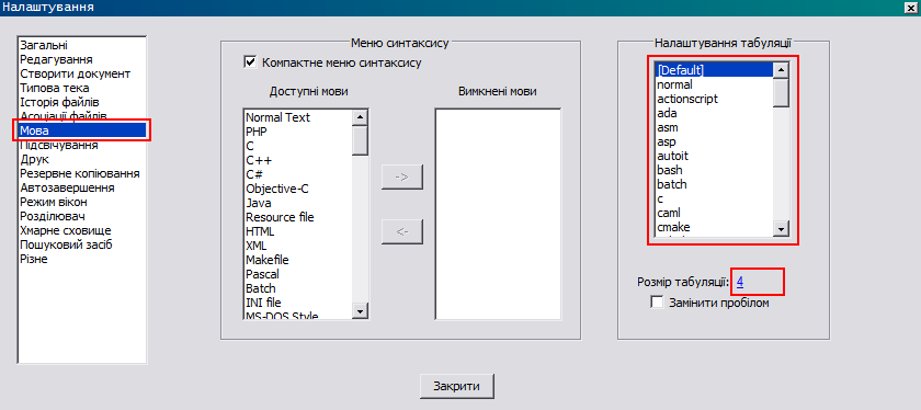 Мова -> Налаштування табуляції -> вибираєте мову -> клік на число