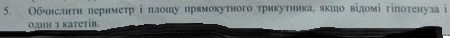 Обчисліть периметр і площу прямокутного трикутника, якщо відома гіпотенуза і один із катетів