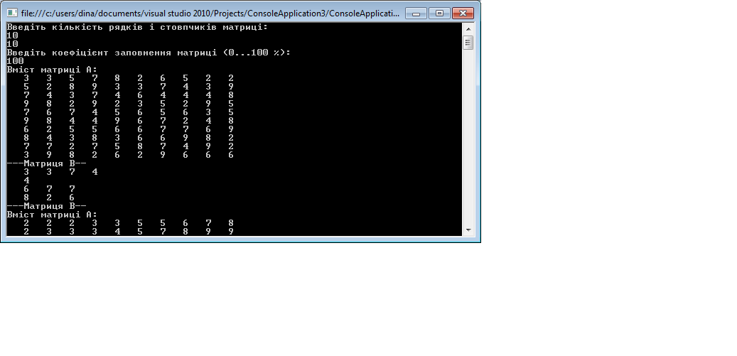Console.WriteLine("Введiть коефiцiєнт заповнення матрицi (0...100 %):");