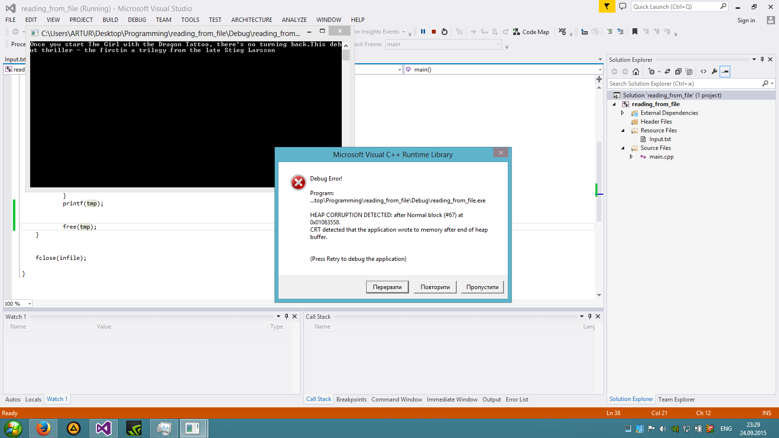 Там помилка щось типу : "HEAP CORRUPTION DETECTED" ]:->