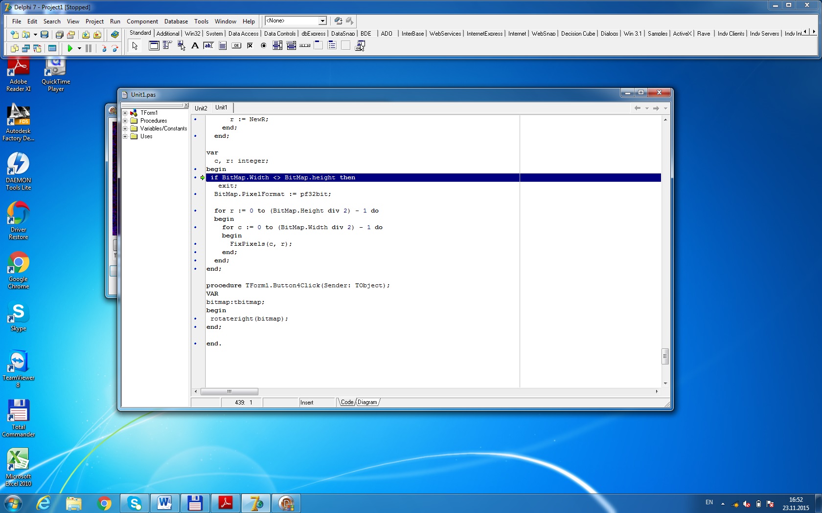 Тільки коли на намагаюся додати виклик цієї процедури в код кнопки, то пише що недостатньо параметрів (якщо вказувати лише імя процедури без bitmap:tbitmap) або ж каже, що очікується '(' замість ':'RotateRight(bitmap); //де бітмап - змінна типу TBitmap, яку ми і повертаємо
