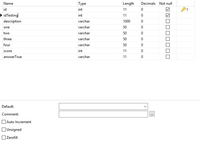 mysql_query("INSERT INTO question (`idTesting`, `description`, `one`, `two`, `three`, `four`, `score`, `answerTrue`)