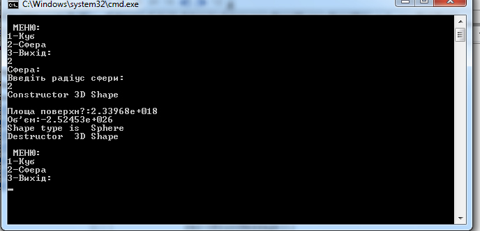 cout<<"\n МЕНЮ: \n1-Куб\n2-Сфера\n3-Вихiд:\n";