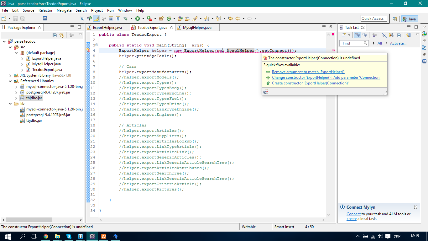 The constructor ExportHelper(Connection) is undefined