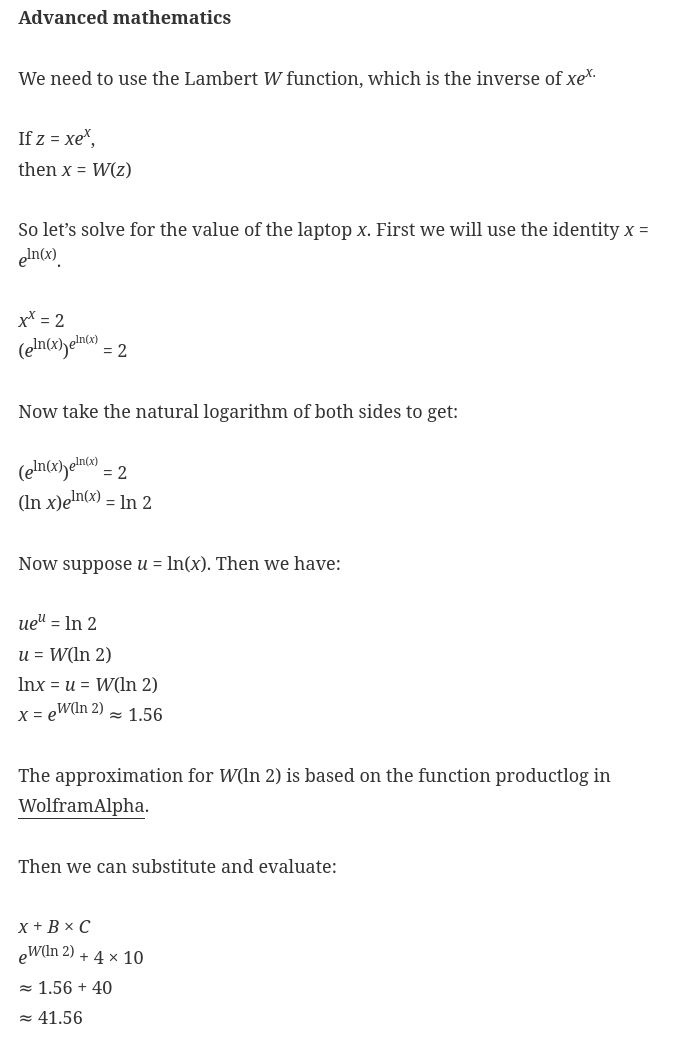 Ну от заради цього я й запостив. Решта подібних задач - шкільна математика. Причому рівня просунутої початкової школи. А тут можна і про лямбди, і про тетрацію поговорити.