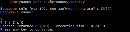 Завдання:    Розробити функцію для порівняння двох українських слів за абетковим порядком. З клавіатури по одному ввести набір українських слів і занести їх у масив рядків. Використовуючи розроблену функцію, відсортувати введені слова за абетковим порядком.