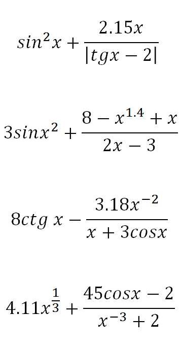 "3sinx^2+8-x^1.4+x/2*x-3 = "<<3*pow(sin(x),2)+((8-pow(x,1.4)+x)/(2*x-3))<<endl<<