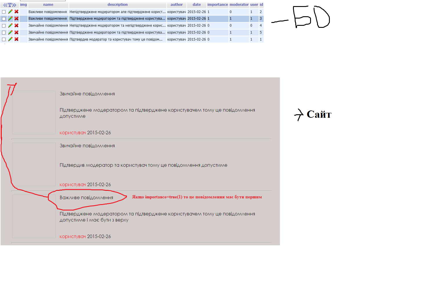 знайти всіх з moderator=true(1) user=true(1) (якщо moderator=false(0) або user=false(0) то непоказувати), спочатку показати importance=true(1) (а потім решту importance=false(0)), сортувати по id у зворотньому порядку, показувати по п'ять