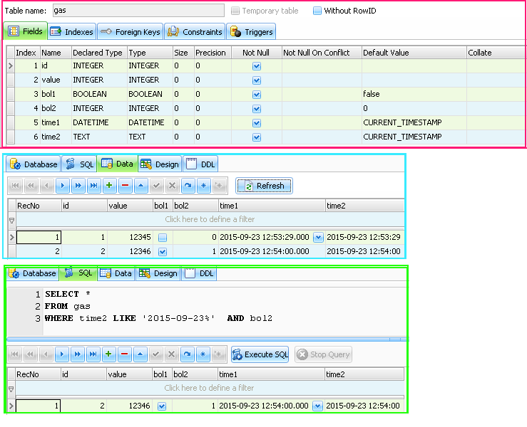А ось в SQLite Expert Personal можна вибирати тип даних BOOLEAN, DATETIME, ... Зробив по дві колонки (кожного типу) при запиті начебто різниці не має, але цікавить, як правильно робити? Як краще прописувати тип колонок?