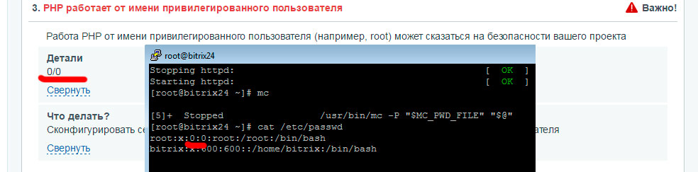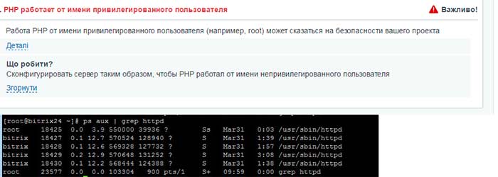 Php працює як модуль Apache - та в httpd.conf прописаний користувач та група User bitrix Group bitrix - тобто php має працювати не від root - так як описується в помилці безпеки. Провірив від якого користувача працює Apache (у вложенному файлі №1). Як мені запустити php під непривілегійованим користувачем? Прошу допомоги.