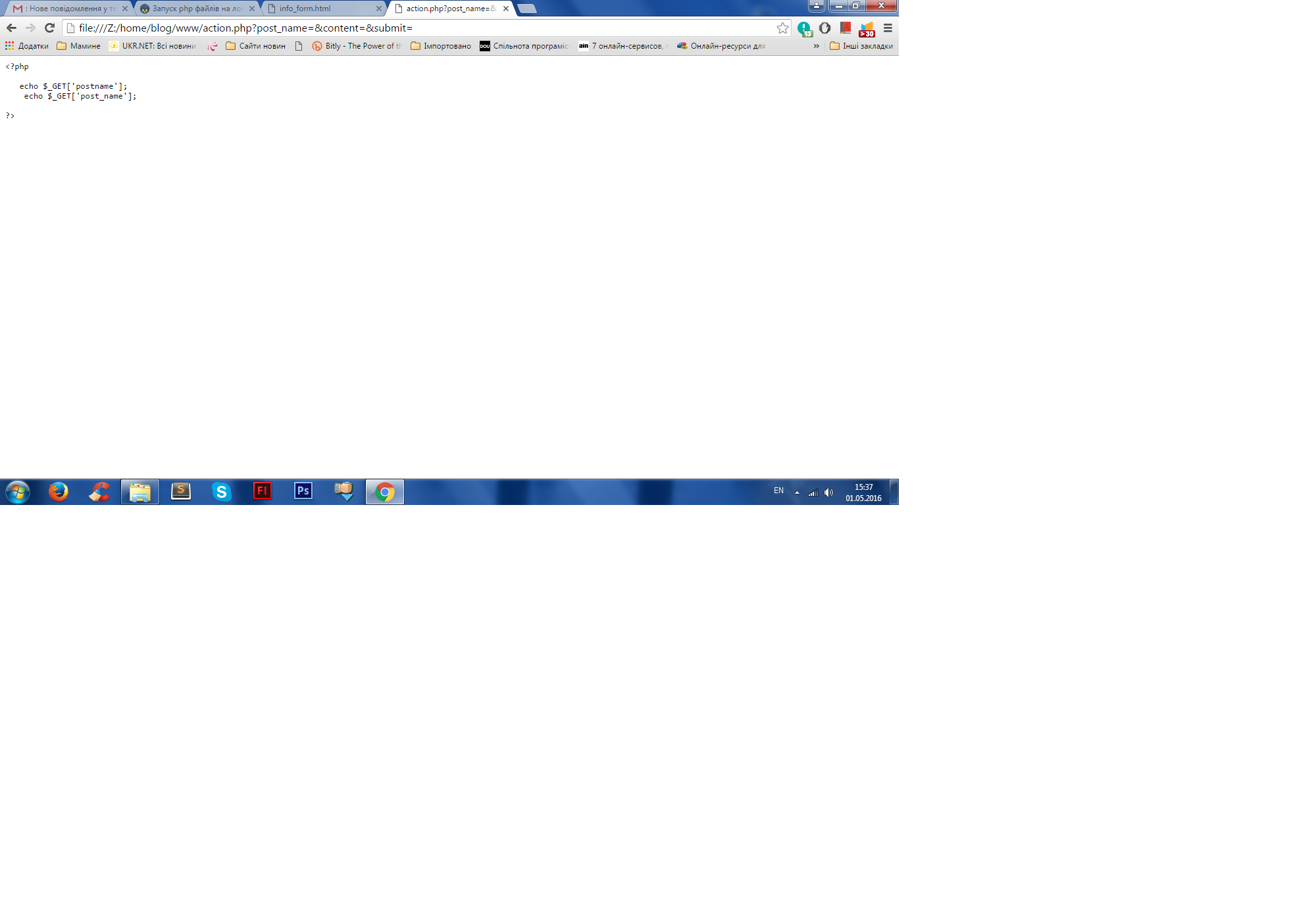 написав html-сторінку,простеньку, і прописав там форму і метод POST, який передає дані на сторінку action.php, але вона не може нормально завантажиться, відображається лише код.