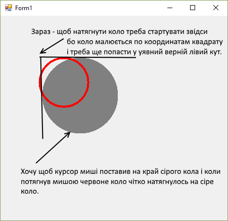 Є вже наперед намальоване коло на picturebox. Потрібно оконтурити його іншим колом, яке малюється за допомоги руху миші. Не можу допетрати, як зробити, щоб коло, яке малюється мишкою, доторкалось своїм краєм до точки де початково натиснув кнопку миші (зараз точка початку це один з кутів квадрату в яке вписується коло). З-за цього не можна точно оконтурить. І ще одна проблема, щоб коло можна було починати малювати в будь якому напрямку, а не тільки в напрямку праворуч-вниз. Зараз більш-менш можна точно оконтурити коли тягнеш мишою праворуч-вниз, а рухом вверх доводити співпадіння кіл. Але думаю що я вигадую лісапєта і є якийсь вже відпрацьований алгоритм.