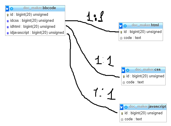 Після вставлення запису (в будь яку із трьох таблиць) мені потрібно взяти останнє id та вставити його у четверту таблицю ("bbcode"), для того щоб утворити відношення 1 до 1
