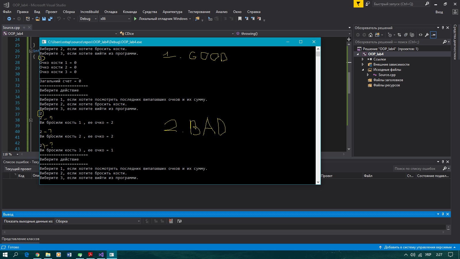 cout << "Ви бросили кость 2 , ее очко = " << b << endl;