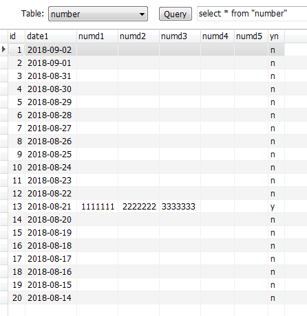 cur1.execute('CREATE TABLE number (id INTEGER primary key, date1 VARCHAR(10), numd1 INTEGER, numd2 INTEGER, numd3 VARCHAR(2), numd4 INTEGER, numd5 INTEGER, yn VARCHAR(1))')