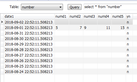 cur1.execute('CREATE TABLE number (date1 VARCHAR, numd1 INTEGER, numd2 INTEGER, numd3 VARCHAR(2), numd4 INTEGER, numd5 INTEGER, yn VARCHAR(1))')