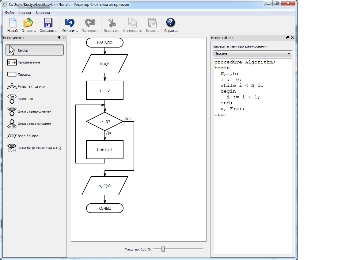 З того часу програмування значно розвинулося. Структурний код із нормальними назвами змінних читається легше, ніж відповідна блок-схема; відтак, сенсу в блок-схемах немає. Але невдахи-викладачі, тяжко травмовані блок-схемами під час свого навчання, як ті дєди в армії, зриваються на салагах, змушуючи їх мести плац ломами, тобто складати ці блок-схеми. Жодного сенсу в блок-схемі, що складається не перед програмуванням, а після нього, тим більше, автоматично за кодом, немає. Тому, якщо вже потрапили до такого нещасного, просто відлагодьте код на паскалі, щоб він робив, що треба, і здавайте без дурних питань тут. Це форум програмістів, а не викладачів-невдах. Дати серйозні поради по блок-схемі ми можемо; але вам же не це потрібно.